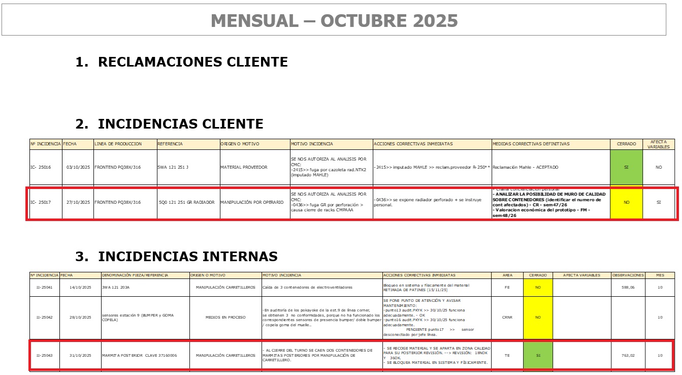 Incidencias y reclamaciones de cliente, octubre 2025, variables noviembre 2025